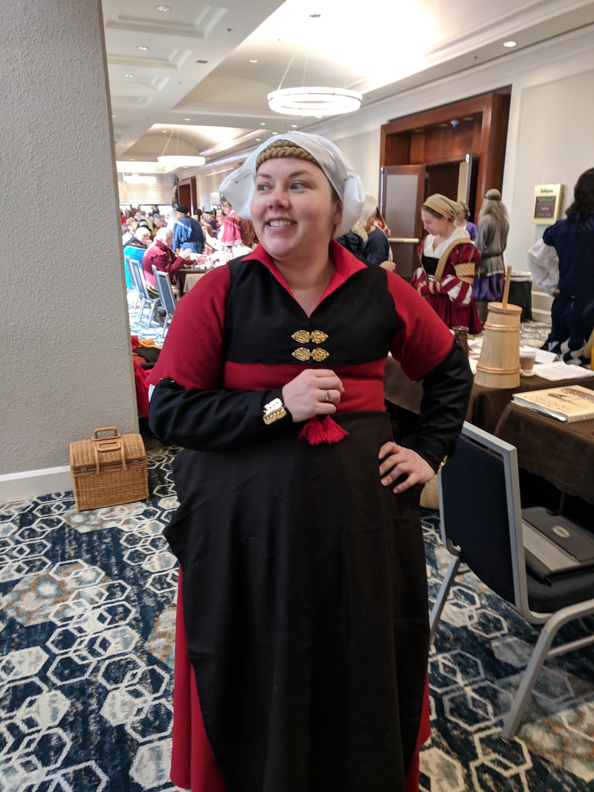 Here's some of the few pictures of me at the event. NAILED IT. (except my foresleeves were too short somehow and I think I understand the mechanics of why even though the foresleeves and the kirtle sleeves were taken from the same pattern and the foresleeves ended 2" above the kirtle sleeves).